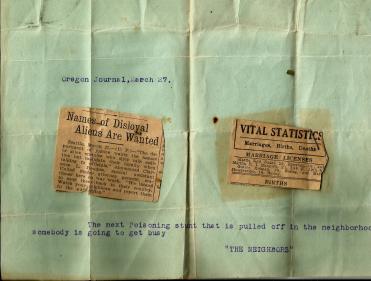 Anonymous threat to have my grandparents deported back to Germany for disloyalty, coupled with “Vital Statistics” listing my grandparent’s marriage to prove “THE NEIGHBORS” know where they live. And…all of this stemming from a “Poisoning stunt.”